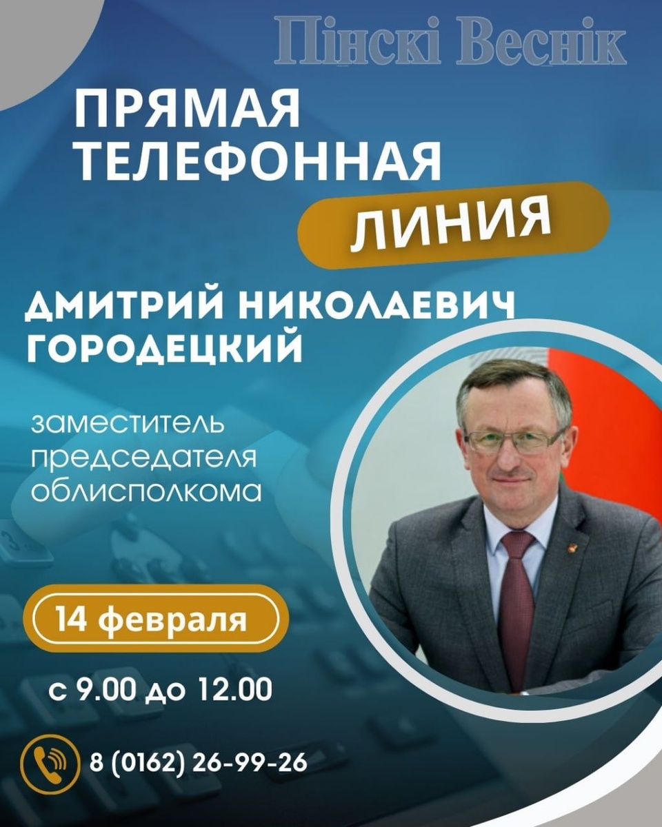 ! ⏩14 февраля с 9.00 до 12.00 прямую телефонную линию проведет первый заместитель председателя облисполкома Дмитрий Николаевич Городецкий по тел.: 8 (0162) 26-99-26. @Пинский Вестник 📱Ютуб 📱ВК 📱ИНСТАГРАМ 📱ОК 📱ФЕЙСБУК 📱ТИК ТОК Прислать новость
