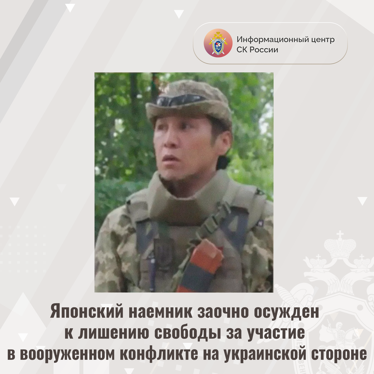 Японский наемник заочно осужден к лишению свободы за участие в вооруженном конфликте на украинской стороне Доказательства, собранные Главным следственным управлением Следственного комитета России, признаны судом достаточными для вынесения заочно приговора в отношении 48-летнего гражданина Японии. Юя Мотомура признан виновным в совершении преступления, предусмотренного ч. 3 ст. 359 УК РФ (наемничество). Следствием и судом установлено, что Мотомура в 2022 году прибыл на Украину и в качестве наемника вступил в ряды украинского вооружённого формирования. Он прошел военную подготовку на территории тренировочных баз, освоил необходимые навыки для участия в конфликте, был обеспечен личным огнестрельным оружием. После этого за денежное вознаграждение Мотомура принимал участие в боевых действиях против представителей силовых структур ДНР и военнослужащих Вооруженных Сил Российской Федерации. Мотомура объявлен в международный розыск, в отношении него судом заочно избрана мера пресечения в виде