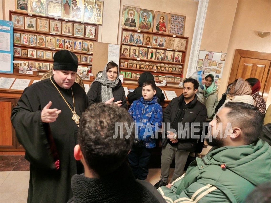 В храме в честь иконы Божией Матери «Умиление» прошла образовательная экскурсия «Этика поведения в православном храме» для иностранных студентов Луганского государственного медицинского университета имени Святителя Луки. Цикл образовательных экскурсий в храмы и мечети проводится по инициативе Общественной палаты Луганской Народной Республики в рамках Года единства народов России. Храм посетили будущие медики из Йемена, Сирии, Ирака и Индии. По словам настоятеля храма, протоиерея Луганского центрального благочиннического округа Луганской епархии Русской Православной Церкви Александра Пономарева, подобные экскурсии для иностранных студентов являются старой доброй традицией: - До 2014 года, на протяжении существования независимой Луганской Народной Республики и после мы вели большую и активную работу с иностранцами, рассказывали о нашей культуре, нашей идентичности и миропонимании. Мы объясняем им как они должны себя ощущать и вести в пространстве той культуры, где они будут учиться и тру