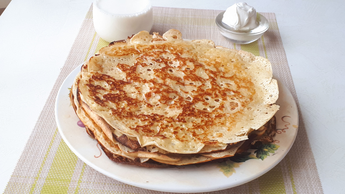 Масленицу и русскую кухню невозможно представить без блинов. Умение печь их, для многих хозяек – это дело чести. Во многих семьях, рецепты приготовления блинов, передаются из поколения, в поколение. Эти рецепты многочисленны и разнообразны. Блины бывают на молоке, кефире или воде. Они также могут быть на дрожжах или с добавлением соды, или разрыхлителя. Старый, проверенный временем, бабушкин рецепт блинов на молоке и дрожжах, один из лучших. Блины получаются тонкие, в дырочку, и очень, очень вкусные. Блины с дырочками на молоке, очень вкусные и сладкие. Рецепт блинов на молоке, быстрый и простой. Блины тонкие с дырочками, принято подавать со сметаной, икрой, солёной рыбой. А также, тонкие блины, можно посыпать сахарной пудрой и подать с медом или вареньем. Блины на молоке, можно украсить свежими ягодами. Для жарки и смазывания: 1. Сначала готовим опару. В глубокую миску, высыпаем сахар, сухие дрожжи и заливаем тёплым молоком. Температура молока, должна быть не выше 38 градусов. Переме