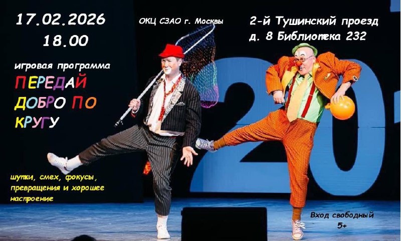 »〽️ ➖➖➖➖➖➖➖➖➖➖➖ Что может быть веселее, чем провести время с клоуном, посмотреть фокусы и увидеть до боли знакомый красный нос? 🪄Клоун Пончик приглашает всех детей и взрослых на веселый праздник, где можно будет отдохнуть, посмеяться, поиграть и увидеть своими глазами превращения из мира иллюзии!🪄 ✨✨✨✨✨ Адрес: 2-й Тушинский проезд, д. 8. Библиотека 232 Дата: 17 февраля 2026 года Время: 18.00. По всем вопросам: +7(916)625-98-76 #окцсзао #волшебство #клоун #праздник #длядетей #детскийпраздник 📱 Подписывайся на наш канал, чтобы не пропустить интересные мероприятия в СЗАО!