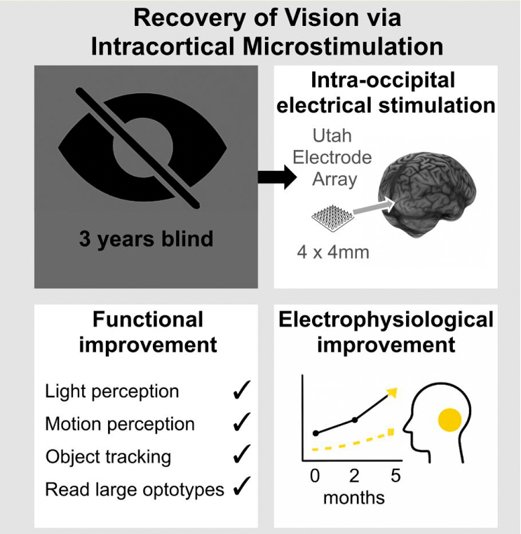 Сегодня в рубрике «Интересный пациент» — довольно странное явление. С одной стороны, это интересный и не до конца объясненный клинический случай. С другой – это свежая клиническая работа, опубликованная в журнале Brain Communications. Суть ее такова, что пациент с отмершим зрительным нервом внезапно прозрел после стимуляции зрительной коры, хотя, казалось бы, путь для проведения сигнала больше не существовал. Но обо всем по порядку. Графическое представление работы. Credit: Alfaro, A., et al. / Brain Communications 2026 Авторы исследования из Испании проводили клинические исследования по стимуляции зрительной коры имплантированными электродами. Добровольцем был 65-летиний пациент, ослепший в 2018 году в результате двусторонней неартериитной передней ишемической оптической нейропатии (или НПИН – Non-arteritic Anterior Ischemic Optic Neuropathy, NAION). Через 3 года и 10 месяцев после окончательного диагноза пациенту имплантировали в зрительную кору, на границу между первичной зрительно