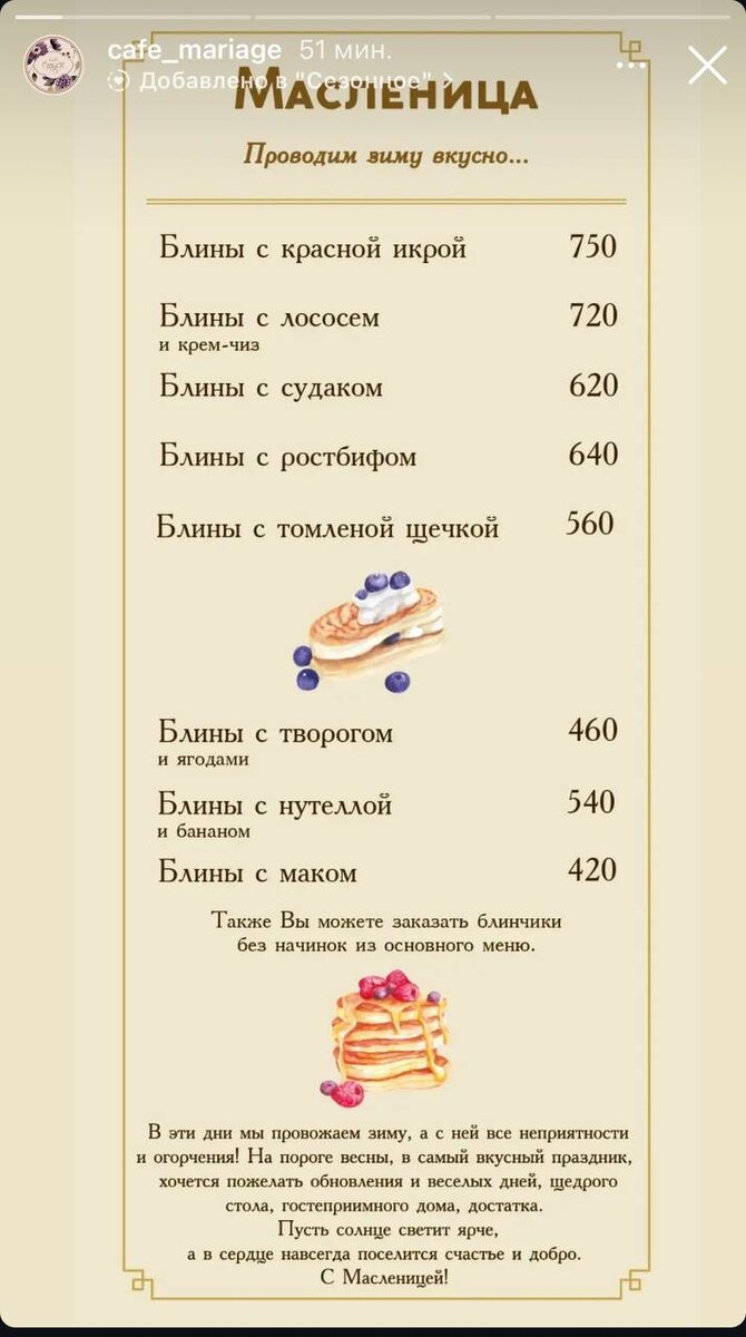 Масленица в Марьяж -как всегда порадует нашими фирменными блинами