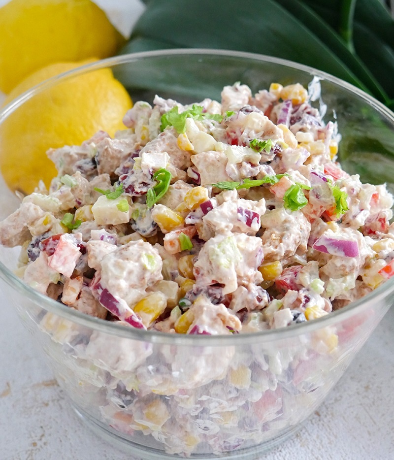Фокус-покус... На самом деле сегодня без фокусов. А вот салат с таким названием у нас в списке имеется. Записывайте рецепт! Он действительно волшебный. Он состоит из интересных ингредиентов, которые в сочетании создают поистине восхитительный вкус. Этот салат оригинален и неповторим. Он обязательно понравится всем, кто его попробует. 500 гр. куриного филе 150 гр. сушеной клюквы или изюма без косточек стебель сельдерея 1 красная луковица 1 сладкий болгарский красный перец 1/2 банки консервированной кукурузы 100 гр. твердого сыра 2 столовые ложки майонеза 4 столовые ложки натурального йогурта 2 зубчика чеснока соль перец приправа для курицы Нарежьте куриную грудку кубиками, посыпьте приправой, солью и перцем. Обжарьте на небольшом количестве растительного масла и отставьте остывать. Замочите клюкву или изюм в горячей воде на 7 минут, чтобы они размякли. Затем слейте воду и промокните ягоды бумажным полотенцем. Нарежьте сельдерей и лук мелко. Удалите семена из красного перца и нарежьте е