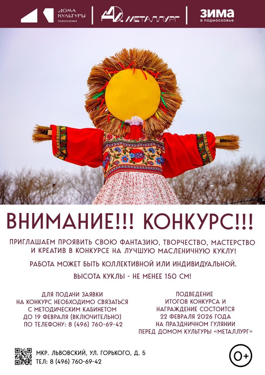 ✨ Конкурс на Масленицу в мкр-не Львовский 👉Заявки до 19.02.2026 по тел 8(496)760-69-42 🏆Награждение 22 февраля 📆 19.02.2026 🏢 Дом культуры «Металлург» 📍 г.о. Подольск, мкр-н Львовский, ул. Горького, д. 5 ⭐Поддержать канал голосом 🍰Где поесть в Подольске ✅ Мероприятия Подольск https://dzen.ru/id/66ed500f7b5671493eca3fd6 http://vk.com/podolsk_events http://dzen.ru/podolsk_events