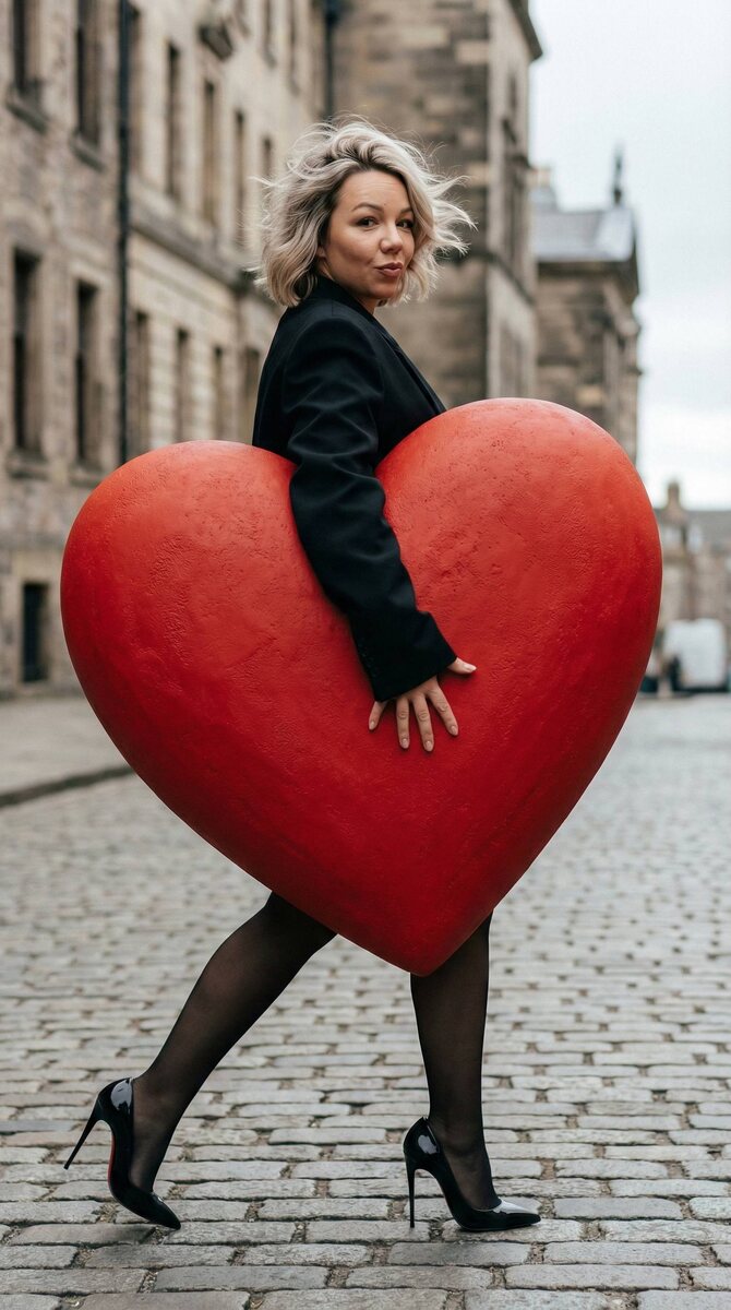 👇🏻 🌟Переходим на удобный сервис для генерации: Ссылка 👉 Syntx Ai Ссылка 👉 Veo3 📌ИНСТРУКЦИЯ ПО ИСПОЛЬЗОВАНИЮ В ЗАКРЕПЛЕННЫХ СООБЩЕНИЯХ ◾️ПРОМТ : Девушка с фото ультрареалистичная high fashion editorial съемка на городской улице каменная брусчатка и фасады зданий дневной пасмурный свет мягкий контраст живая репортажная динамика кадр по пояс и ниже так что средняя часть тела почти полностью перекрыта огромным красным сердцем которое она тащит сбоку удерживая одной рукой ладонь раскрыта и упирается в поверхность сердца вторая рука не попадает в кадр сердце очень большое матовое с легкой фактурой занимает большую часть кадра видны ноги часть торса и линия плеч девушка идет боком в шаге и слегка оборачивается назад через плечо взгляд в сторону камеры настроение уверенное и игривое обувь черные лаковые лабутены с острым носом на очень высокой шпильке тонкие черные колготки 5 den на ней черный оверсайз пиджак с огромными геометричными плечами удлиненные рукава закрывают кисть до