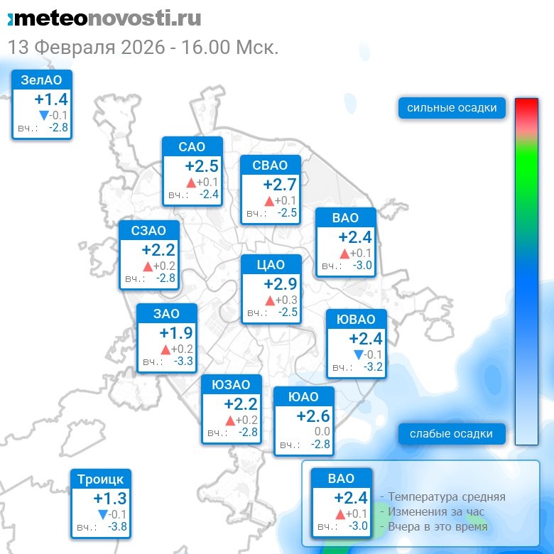 В 16:00 в Москве было от +1°C до +3.1°C, средняя температура +2.3°C #погода #Москва #зима #температура #13февраля #пятница