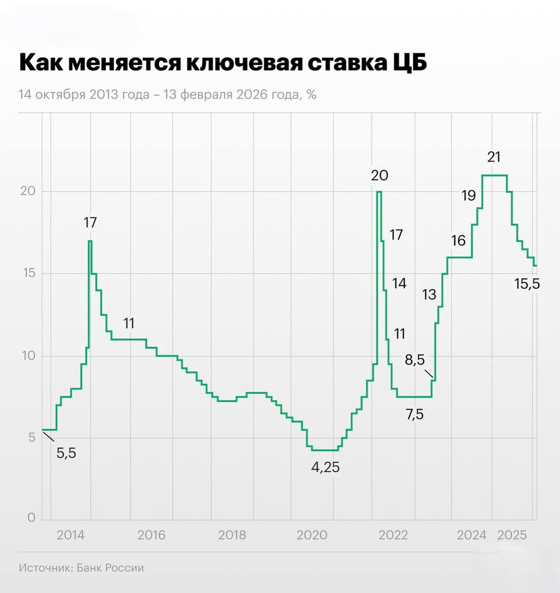 ⚡️ Сегодня, 13 февраля 2026 года, совет директоров Банка России принял решение, которого многие уже перестали ждать: ключевая ставка снижена на 50 б.п. — с 16% до 15,5% годовых. Это шестое подряд снижение в текущем цикле смягчения денежно-кредитной политики. Что стоит за этим решением, какие сигналы подает регулятор ⬇️ Анатомия решения: почему ЦБ пошел на снижение? Решение выглядит смелым на фоне январской статистики. Регулятор открыто признает: в январе рост цен ускорился. Но это — разовый фактор, главный из которых — повышение НДС до 22%. Ключевые аргументы ЦБ: — Устойчивые показатели инфляции существенно не изменились — После отработки разовых факторов (налоги и тарифы) инфляция возобновит снижение — Тренд на замедление подтверждается недельными данными: годовая инфляция на 9 февраля — 6,3–6,37% Важный нюанс: ЦБ действует осторожно. Реальная ключевая ставка (за вычетом текущей инфляции) остается жестко положительной — около 9–10%. Это значит, что регулятор продолжает сдерж