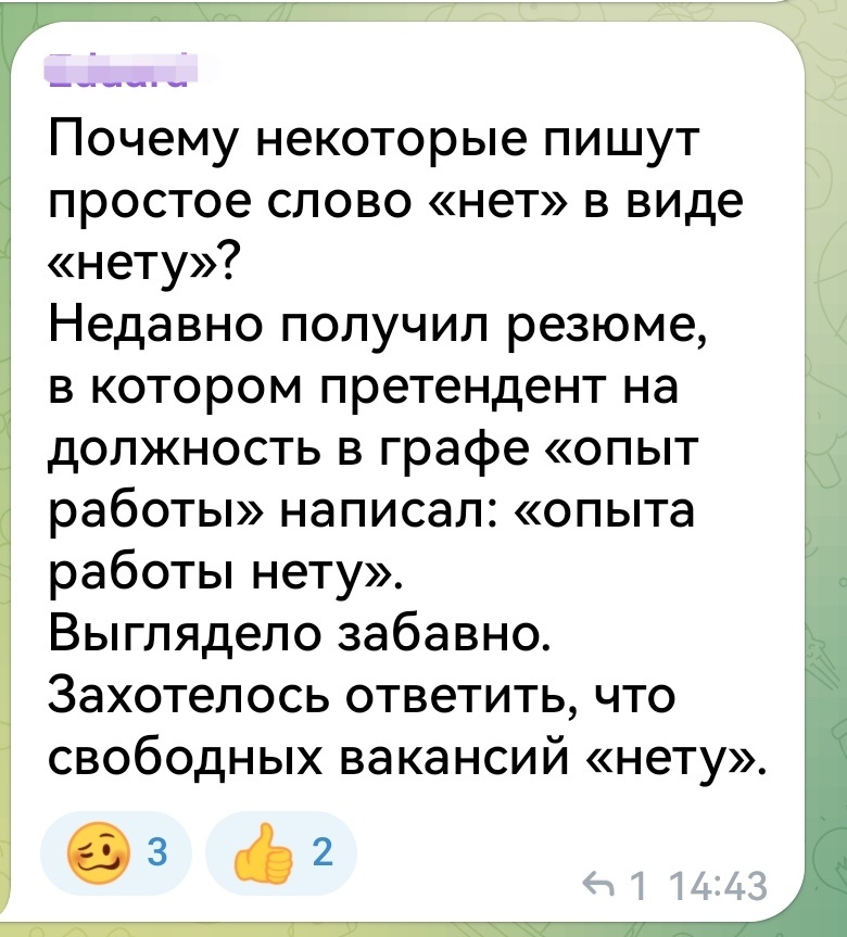 Итак... прилетает в ответ на "нету" вот такое внушение. Внушение-рассуждение. Один взрослый человек (эйчар?) типа как бы "иносказательно" делает другому прилюдно фейсом об тейбл. Написано было не мне, я вообще сторонний наблюдатель, но "прочитала" это я именно так. А теперь представьте себе, что почувствовал тот, кто — о, боги!!! — употребил в своём (вообще-то ни разу не официальном) сообщении это самое слово?