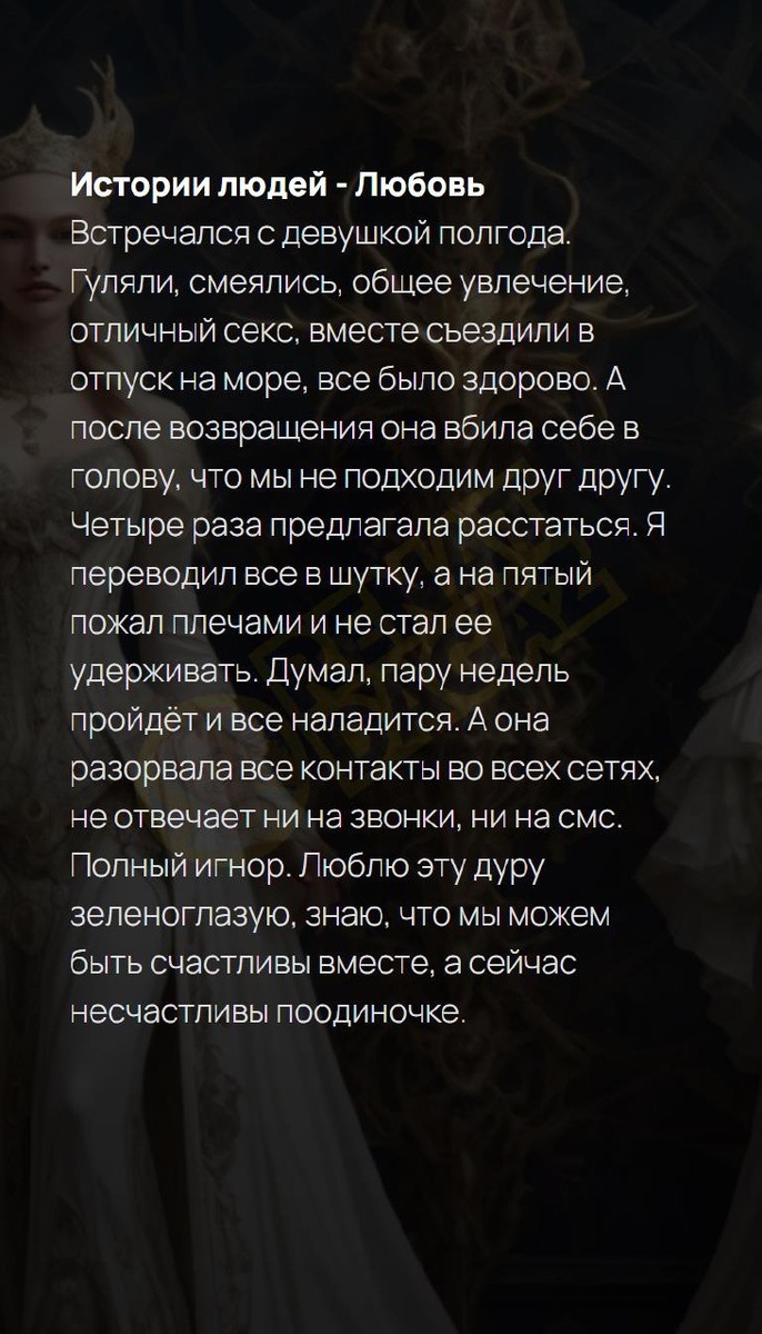 Истории людей - Любовь Встречался с девушкой полгода. Гуляли, смеялись, общее увлечение, отличный секс, вместе съездили в отпуск на море, все было здорово. А после возвращения она вбила себе в голову, что мы не подходим друг другу. Четыре раза предлагала расстаться. Я переводил все в шутку, а на пятый пожал плечами и не стал ее удерживать. Думал, пару недель пройдёт и все наладится. А она разорвала все контакты во всех сетях, не отвечает ни на звонки, ни на смс. Полный игнор. Люблю эту дуру зеленоглазую, знаю, что мы можем быть счастливы вместе, а сейчас несчастливы поодиночке. #соседи #бытьчеловеком #мудрость #обычныелюди #бумеранг #случайвметро #семья #отсердцаксердцу #верность #соседи #бытьчеловеком #мудрость #обычныелюди #бумеранг #случайвметро #семья #отсердцаксердцу #верность расшифруйте свой уникальный код | расшифруйте свой уникальный код | расшифруйте свой уникальный код T | VK | Pin | YouTub | Dzen Истории людей - Любовь Встречался с девушкой полгода. Гу… #13число #13февр