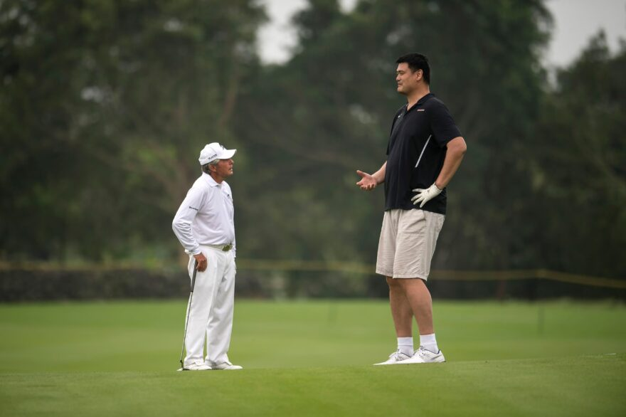 Этот снимок сделан 23 октября 2016 года во время World Celebrity Pro-Am 2016 в гольф-клубе Mission Hills Haikou. В кадре — Яо Мин (229 см), бывшая звезда Houston Rockets, и Гарри Плейер, девятикратный победитель мейджоров. Это не постановка и не церемония — обычный разговор между лунками во время Pro-Am. Яо в чёрном поло и шортах, с перчаткой на руке, судя по жесту, что-то объясняет. Плейер — в своём фирменном белом комплекте — внимательно слушает. Контраст роста делает сцену почти комичной, но по сути это типичный момент Pro-Am: спортсмен из другого вида спорта пробует себя в гольфе, а легенда тура — рядом, в роли наставника и собеседника. Mission Hills — крупнейший гольф-комплекс мира, который часто собирает международных звёзд спорта и шоу-бизнеса. Интересная деталь: при росте 229 см Яо приходится играть клюшками с удлинённым шафтом, иначе стойка становится чрезмерно согнутой. В таких деталях Pro-Am и становится любопытным — здесь видно, как гольф адаптируется под человека, а не нао