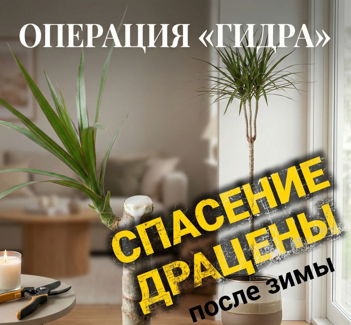 ? 🐉✂️ За зиму ваша драцена (она же «ложная пальма») превратилась в грустную удочку? Ствол оголился, листья остались только на макушке, и она упирается в потолок, как Пизанская башня? Многие новички боятся этого момента. Им жалко резать. Они подвязывают её, уговаривают, но она все равно выглядит жалко. Стоп. Драцена — это растение-феникс. Ей нужна не жалость, а хирургическое вмешательство. Сейчас, в конце февраля — идеальное время для операции «Гидра». В чем суть? В природе драцена работает по принципу мифической Гидры: отрубаешь одну голову — вырастают две или три. Мы искусственно убираем «точку роста», и растение в панике (или от радости) будит спящие почки на стволе. ИНСТРУКЦИЯ (Для смелых): 1. Казнь. Возьмите острый нож (не ножницы, они мнут ткани!). Протрите лезвие спиртом/водкой. Решительно срежьте верхушку. * *Где резать?* Оставьте пенек той высоты, которая вам нужна (обычно 15–30 см, но можно и выше). Не бойтесь, это не убийство. 2. Тромб (Секрет профи). Све