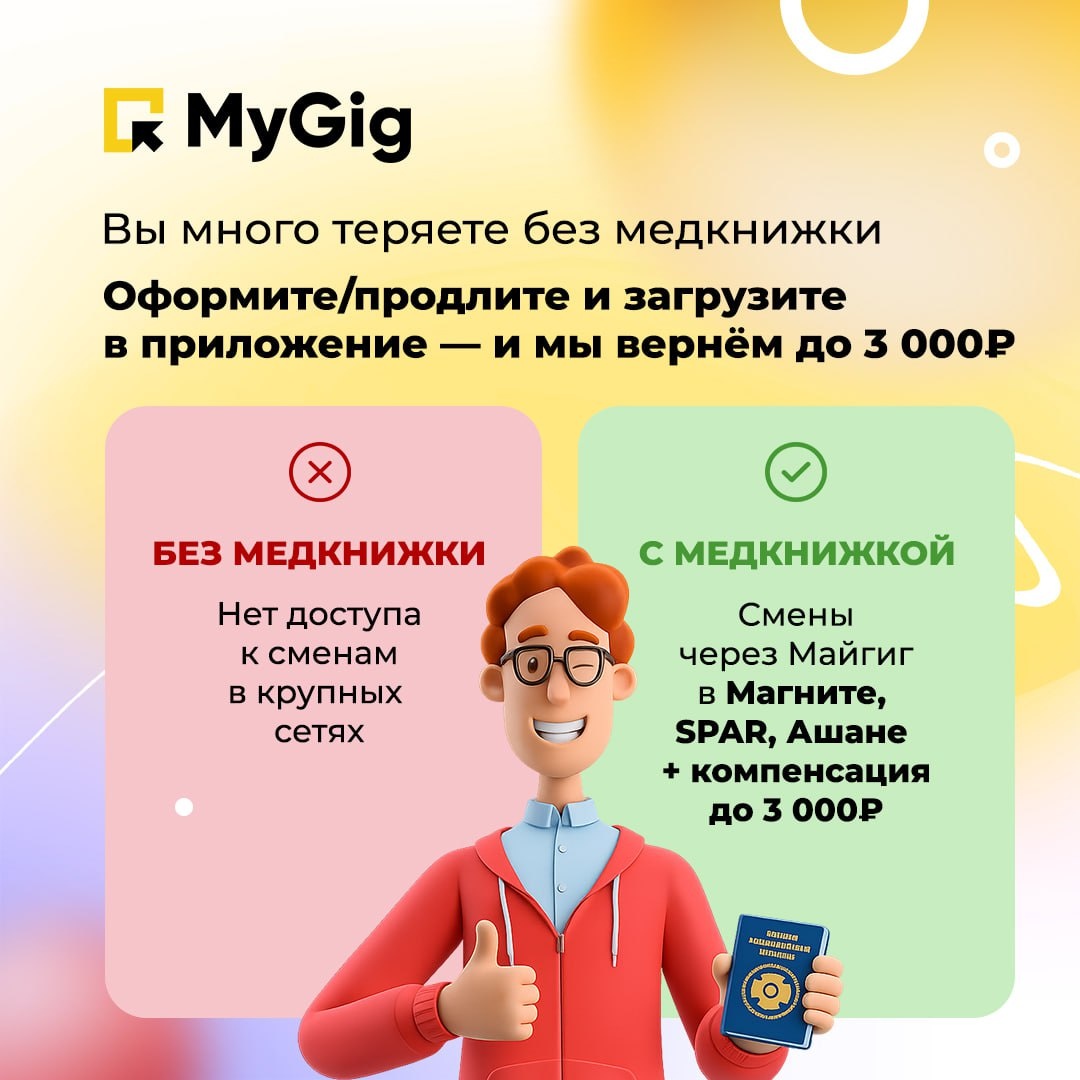 ? Отлично — вы можете подрабатывать в Магните, SPAR, Ашане и других крупных сетях 🥳 Нет? Вы много теряете — и по доходу, и по удобству Но есть решение: оформите ЛМК — мы вернём до 3 000 ₽! Акция действует для новых и действующих гигеров 🫶 Подробные условия Бронируйте смены, чтобы заработать и компенсировать ЛМК прямо сейчас! Например: 🛒 Магнит — Ярославль, пр-кт Машиностроителей, 3 (продавец-универсал) — Кострома, ул. Костромская, 80 а (РТЗ) — Подольск, ул Циолковского, 13к4 (РТЗ) ⚡️ — Москва, ул. Большая Филёвская, 21к1 (продавец-кулинар) ⚡️ — Воронеж, ул. 9 Января, 223Б (сборщик заказов) ⚡️ — Санкт-Петербург, ул. Магнитогорская, 11 (РТЗ)⚡️ 🛒 SPAR — Сестрорецк, ул. Токарева, 15А (РТЗ) — Москва, пл. Смоленская, 3 (РТЗ) — Кстово, пл. Ленина, 5 (подсобный рабочий) ⚡️ — Нижний Новгород, ул. Белинского, 124 (курьер) ⚡️ — Казань, ул. Мамадышский Тракт, 46 (курьер) ⚡️ 🛒 Ашан — Ржавки/МО, Фирсановская, мкр №2, 20 (РТЗ) — Тамбов, ул. Советская, 194Б (РТЗ) ⚡️ — Порошкино/ЛО, км КАД (