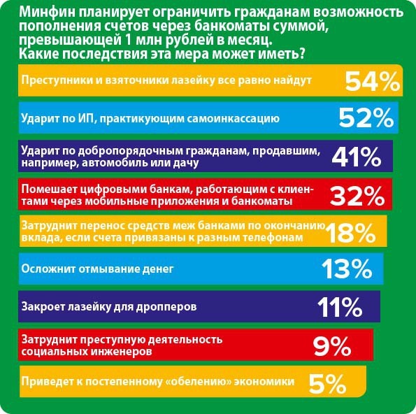 , превышающей 1 млн рублей в месяц. Какие последствия эта мера может иметь?" Подводим итоги! Итак, свыше половины опрошенных (54%) уверены: преступники и взяточники лазейку все равно найдут. Почти столько же (52%) респондентов опасаются: данная мера ударит прежде всего по ИП, практикующим самоинкассацию. 32% респондентов считают, что такое устрожение помешает развиваться цифровыми банкам, работающим с клиентами через мобильные приложения и банкоматы. А 18% сетуют, что новые ограничения могут затруднить добропорядочным клиентам перенос собственных средств меж банками по окончанию вклада, если счета привязаны к разным телефонам. Только 13% верят, что новая мера осложнит отмывание денег, 11% – закроет лазейку для дропперов, 9% – затруднит преступную деятельность социальных инженеров и, наконец, 5% – приведет к постепенному «обелению» экономики. Правы ли эти немногочисленные оптимисты? Поживем-увидим! Данный вопрос наряду с другими актуальными темами будет рассматриваться в рамках