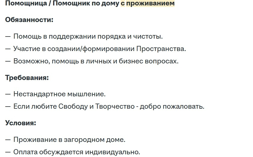 Какая вещь мне очень часто кажется надуманной, когда я читаю современные книги или смотрю фильмы? То, что герой, попав в ту или иную трудную ситуацию, вынужден решать свои проблемы в полном одиночестве. Скажем, его увольняют с работы или обманом лишают единственного жилья и всех сбережений. Практически всегда по воле создателей герои оказываются в полной изоляции от всех остальных, бьются в одиночку, преодолевают трудности сами или находят спасителя. (В женских романах эта схема часто используется - она все потеряла, но тут появляется супер-кенгуру и берет ее на ручки). Но в реальности вокруг любого человека всегда множество социальных связей. Лишился жилья – тебя пустят хотя бы перекантоваться на какое-то время братья, сестры, друзья, коллеги по работе, двоюродная сестра из Саратова, одинокая соседка, которая нуждается в уходе и т.п. (Кстати, есть еще много вакансий с проживанием, вот только что сделала скрин подобной). С деньгами аналогично. Нормальный человек имеет большой кру