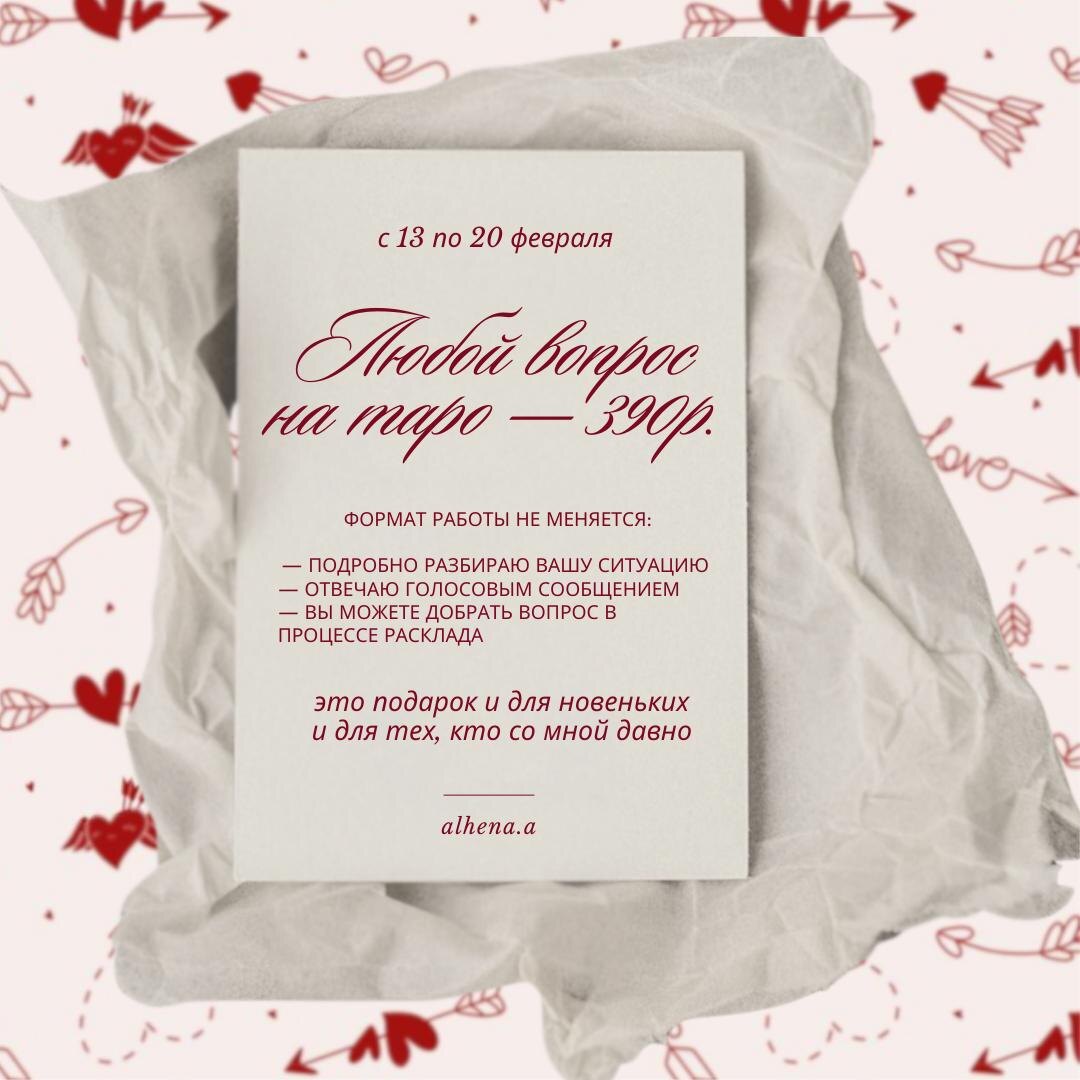 … И ДЕЛАЮ ДЛЯ ВАС ЛУЧШИЙ ПОДАРОК НА 14 ФЕВРАЛЯ 🩷 Понимаю, что у многих из вас есть вопросы, ответы на которые хочется получить здесь и сейчас! Поэтому я снижаю цену на расклад, чтобы вы смогли узнать, как можно использовать подсказки таро в своей жизни. В честь всех влюбленных я решила устроить классный челендж и посмотреть, как вам такой формат работы со мной. ❗️НЕДЕЛЮ С 13 по 20 февраля -> вы можете прийти ко мне с любым вопросом и получить ответ всего за 390 рублей! У меня такого никогда не было! Жду вас и ваши вопросы здесь 🫶🏻 - @AlhenaMW