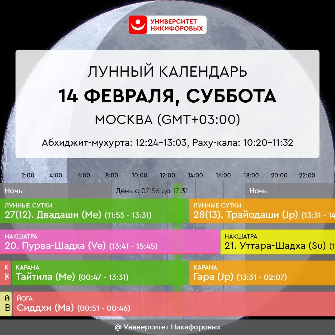 Суббота середины февраля деятельная и активная – используйте эту энергию как в отдыхе, сделав его более динамичным, так и в рабочей или домашней деятельности, если у вас есть такая потребность. Начало путешествий и долгие поездки на машине лучше отложить. А вот вдохновляющие фильмы, творчество или изучение чего-то глубокого пойдут на пользу и принесут удовлетворение. После 16 часов пространство станет более собранным и серьезным. Захочется четкости и режима. В это время благоприятно заняться чем-то одним, погрузиться в процесс с головой, не распыляясь на сотню мелочей. Полезно проявить искреннюю благодарность к тем, кто помогает вам по жизни — это может открывать новые двери. Ближе к 22 часам Марс переходит в накшатру Дхаништха. Это событие добавит внутренней решительности на будущее. Так что засыпать вы будете уже с новым, приятным ощущением силы.