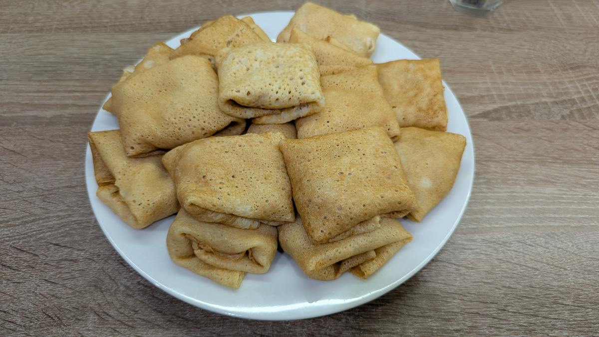Этот рецепт — настоящая палочка-выручалочка. Он работает безотказно, и блины получаются тонкими и вкусными даже у тех, кто печет их впервые. Главное — соблюсти пропорции, и тесто вас не подведет. Эти блины на кефире с добавлением кипятка получаются невероятно нежными и эластичными — в них можно завернуть много сочной начинки, и они не порвутся. Готовим сытную начинку из вареного мяса с золотистым лучком и капелькой бульона для сочности. 💡 Важный совет новичку от тех, кто уже испек: Обязательно используйте хорошую разогретую сковороду (лучше всего блинную или с антипригарным покрытием). Это залог того, что первый блин не будет комом, а все остальные легко перевернутся и красиво зарумянятся. Список ингредиентов: Если у вас вместо кефира молоко, то возьмите 1 стакан молока и 0,5 стакана кипятка. В миску разбейте 2 яйца, добавьте соль, сахар. Перемешайте венчиком. Добавьте стакан кефира. Перемешайте. Добавьте просеянную муку, перемешайте, чтобы не было комочков. Влейте стакан горячей воды