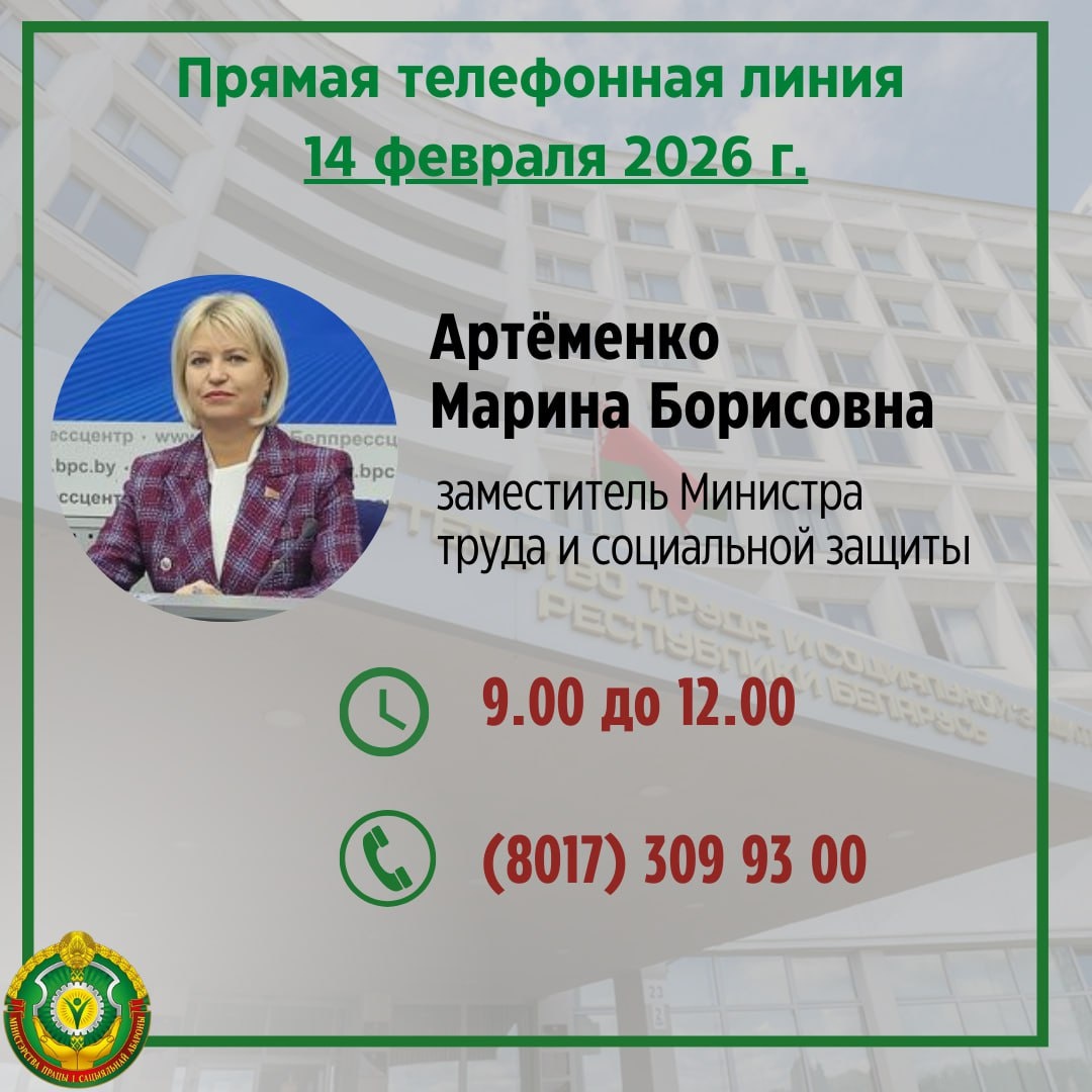 14 февраля с 9:00 до 12:00 состоится прямая телефонная линия с Мариной Борисовной Артёменко, заместителем Министра труда и социальной защиты. 🔽Темы: ▪️вопросы социального обслуживания населения; ▪️государственная адресная социальная помощь; ▪️обеспечение техническими средствами социальной реабилитации. ☎️Телефон для связи: (8017) 309 93 00
