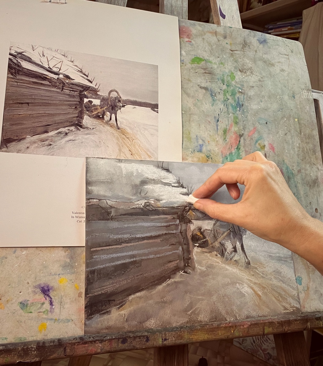 Но это не простое повторение. Это диалог через время. Ты всматриваешься в чужую работу и пытаешься понять: а как у него это получилось? Где тут свет? Как замешаны эти тени? Почему от картины веет таким покоем? Сейчас мой «учитель» — Валентин Серов, картина «Зимой» (1898 г.). На первый взгляд — сдержанная, почти монохромная гамма. Но чем дольше смотришь, тем больше она раскрывается. Серый оказывается не серым, а сотнями оттенков: сизый, лиловый, голубоватый, жемчужный... Это как разговор шёпота, который слышен только внимательному слушателю. Моя задача — переложить эту сложную масляную палитру на язык сухой пастели. Передать тот же свет, ту же тишину, то же морозное дыхание — но другими средствами. Это удивительный, почти медитативный опыт. И знаете, что я поняла в процессе? 🎨 Творчеству часто мешает не отсутствие времени, а вот этот товарищ — Внутренний Критик. Тот, который стоит за спиной и шипит: «Куда лезешь? Сразу шедевр давай! А если не получится — зачем начинать?» Я учусь обходи