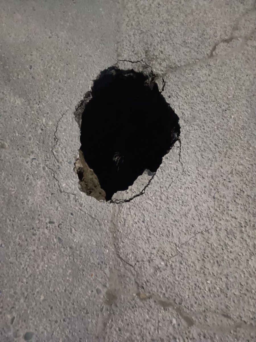Это провал! Возле дома на ул. Думенко, 4 на дороге внезапно образовалась дырка. Аккуратнее там