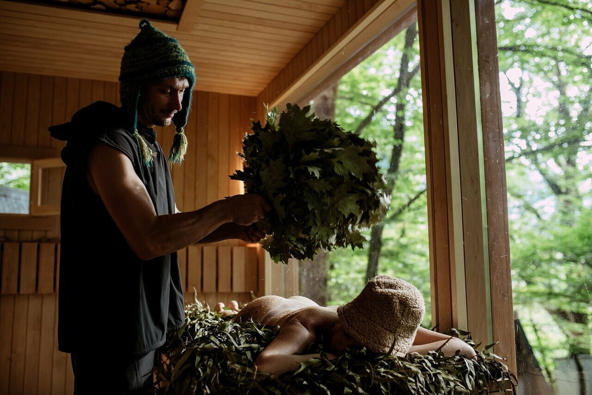 - Русская парная «по-мещерски» (мягкий пар). Классика деревенских бань. Температура здесь невысокая (50-65°C), зато влажность может достигать 70-80%. Пар должен быть легким, «не жгучим». Такой эффект дают только печи с закрытой каменкой, где камни лежат внутри и не контактируют напрямую с воздухом парилки.