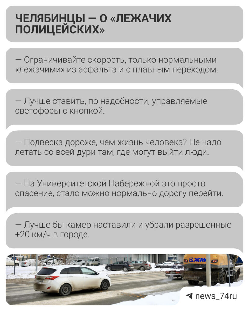 «Нарушителей ваши кочки только веселят» Челябинцы — о новых «лежачих полицейских» Установка неровностей вызвала споры среди горожан, высказались и водители, и пешеходы. В нашем опросе 51% проголосовавших оказались противниками такого количества пластиковых «лежачих полицейских». Некоторые автомобилисты предлагают честно предупреждать, что на скорости 40 км/ч ездить по пластиковым «лежачим» не стоит, и установить новые знаки — например, на 5 км/ч. Самые яркие комментарии собрали в карточки ⬆️