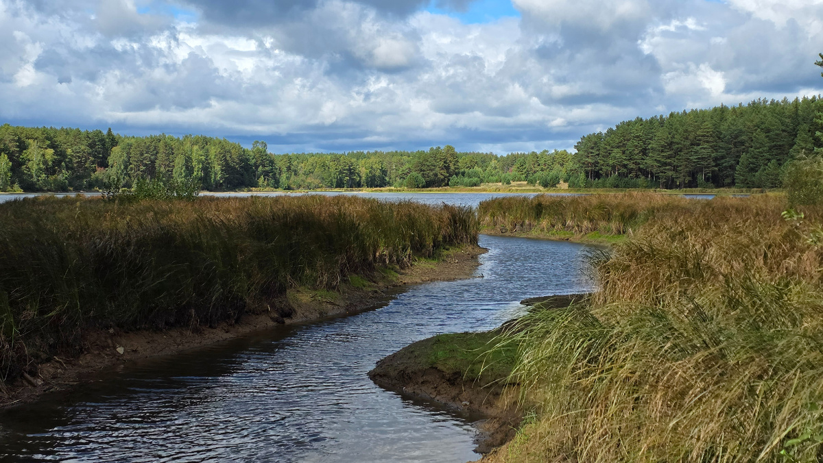Дальше тропа уводит к берегу пруда, где при низкой воде появляется песчаная коса. Лето 2025 было очень дождливым, коса была затоплена, и лишь ее дальняя более возвышенная часть выступала над водой.