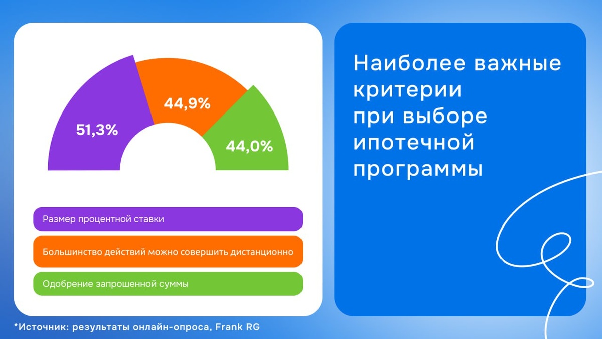 Что действительно важно при выборе ипотеки Согласно клиентскому опросу Frank RG, для 51% заёмщиков ключевым фактором при выборе ипотечной программы остаётся размер процентной ставки. Этот параметр формирует базовую стоимость кредитования и определяет долгосрочную финансовую нагрузку на семейный бюджет.