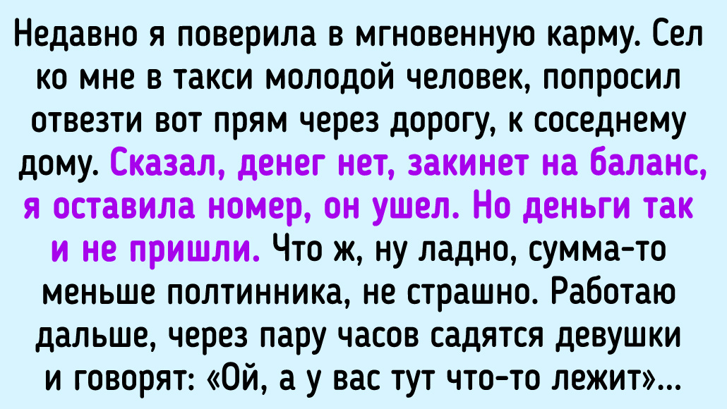 Недавно я поверила в мгновенную карму. Сел ко мне в такси молодой человек, попросил отвезти вот прям через дорогу, к соседнему дому. Сказал, денег нет, закинет на баланс, я оставила номер, он ушел. Но деньги так и не пришли. Что ж, ну ладно, сумма-то меньше полтинника, не страшно. Работаю дальше, через пару часов садятся девушки и говорят: «Ой, а у вас тут что-то лежит». Паспорт! Стала мучительно думать, чей это паспорт, и тут меня осенило! Нашла того парня в соцсети, написала. На следующий день позвонил, извинялся насчет долга. Поехала и отдала паспорт, он сунул мне сотку, а взгляд на меня так и не поднял. Ну что тут сказать, следите за вещами и не обманывайте таксистов, Земля-то круглая! © ZlayaZaya666 / Pikabu