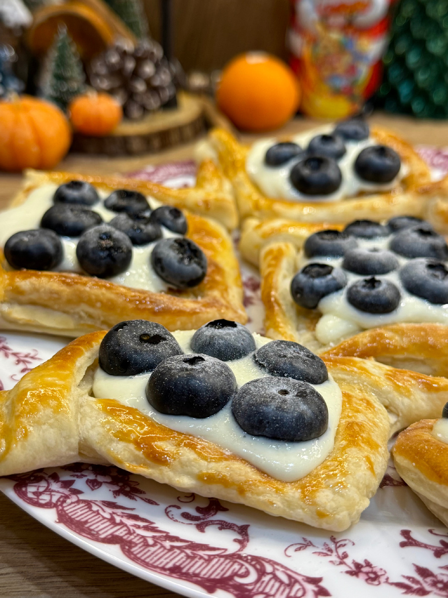 7. Остудите слойки, отсадите крем с помощью кондитерского мешка и выложите голубику.
