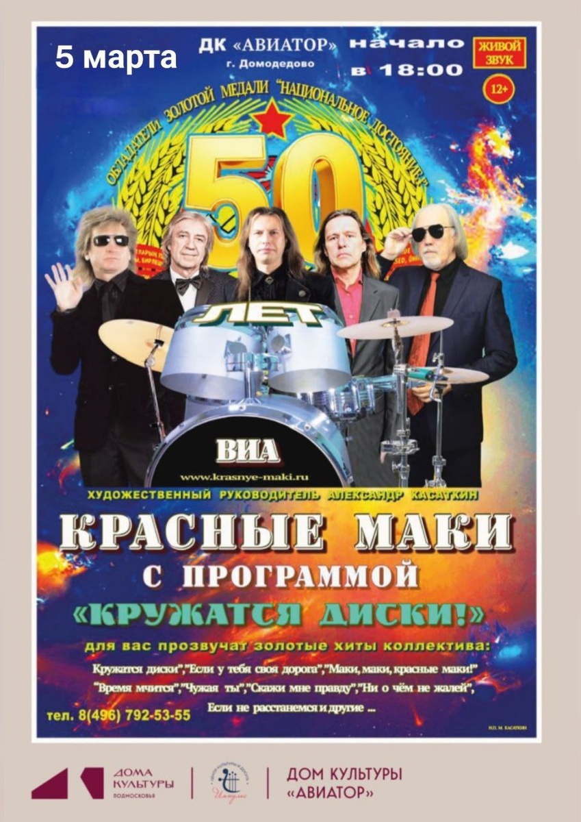 ✨ ❗️ "КРАСНЫЕ МАКИ" ❗️ ПРИГЛАШАЕМ НА КОНЦЕРТ! 💫 ВИА "КРАСНЫЕ МАКИ " В 2003 году при содействии "Союзконцерта"в городе Москве,после длительного перерыва был заново возрождён легендарный ВИА "КРАСНЫЕ МАКИ". В 2007 году коллектив снялся в сериале "СРОЧНО В НОМЕР",который имел большой успех на канале РТР, где прозвучала песня в исполнении ВИА "КРАСНЫЕ МАКИ " "Слезы любви ". В этом же году коллектив был награждён Золоттым орденом "СЛУЖЕНИЯ ИСКУССТВУ ". 🚫 Возраст: 12+ 📆 05.03.2026🕒18:00 🏢 Городской дом культуры «Авиатор» 📍 г. Домодедово, ул.Гагарина, д.1 🎫 Купить билет: https://art-concert.intickets.ru/seance/66137854/ ✅ Мероприятия Домодедово https://dzen.ru/id/66f10385cc4c5a16f7b5fb02 http://vk.com/domodedovo_events http://dzen.ru/domodedovo_events