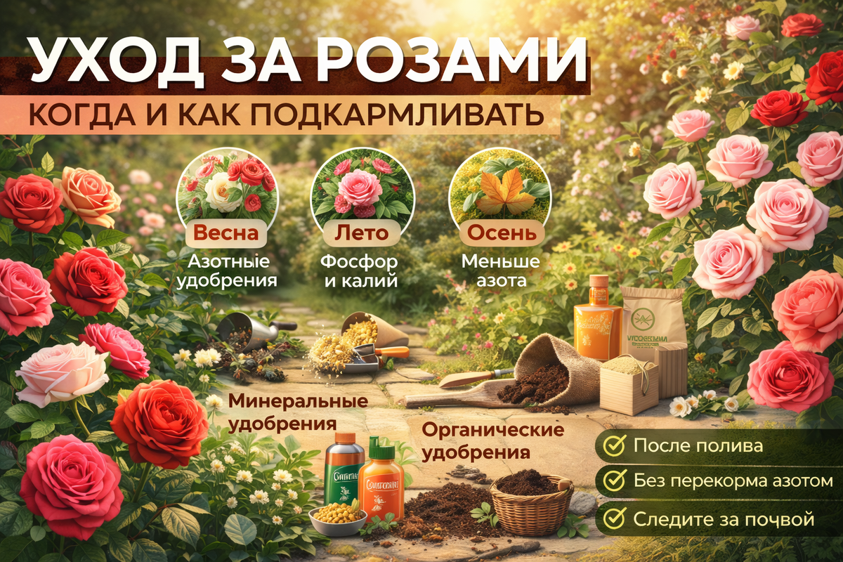 Розы — это одни из самых красивых и популярных цветов в садоводстве. Чтобы они радовали вас своим цветением и здоровьем, нужно уделить внимание не только поливу и обрезке, но и правильной подкормке. Ведь именно от удобрений зависит, насколько пышными и яркими будут ваши розы. Подкормка роз — важная часть ухода за ними. Вот несколько ключевых моментов, когда и как их подкармливать: В зависимости от климата региона, в котором растут ваши розы, может потребоваться адаптация схемы подкормки. В более холодных регионах следует уделять особое внимание осенним подкормкам, чтобы подготовить растения к зимовке. Уход за розами требует терпения и внимания, но правильная подкормка поможет вам наслаждаться красивыми и здоровыми растениями на протяжении всего сезона.