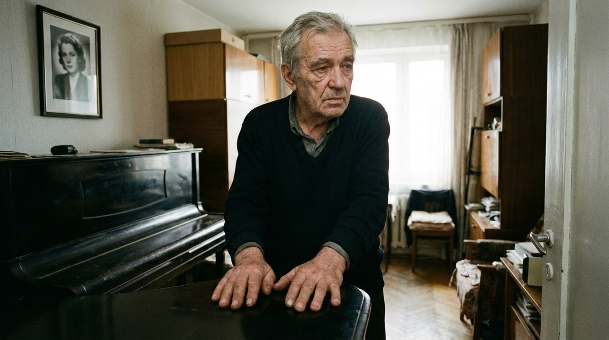 Он встаёт, подходит к роялю. Кладёт ладони на закрытую крышку. Жест привычный – он делал это тысячи раз, я понимаю это по тому, как естественно ложатся руки.
