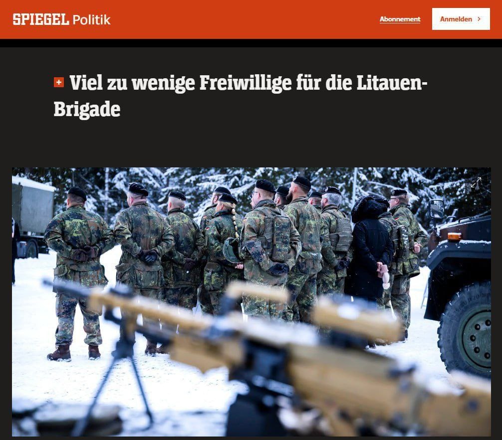 ▪️Берлину не хватает добровольцев для формирования соединений, которые планировалось развернуть в Литве к 2027 году для «сдерживания России». ▪️По данным Der Spiegel, в 203-й танковый батальон записались 197 человек при потребности в 414. В 122-й — 181 из необходимых 640. ▪️Согласно внутренним документам бундесвера, набрано около 10% от запланированной Deutschland kann keine Brigade zur „Rettung Litauens vor Russland“ aufstellen, berichtet der Spiegel. Berlin fehlen Freiwillige für die Einheiten, die bis 2027 in Litauen stationiert werden sollen, um Russland einzudämmen. Laut Spiegel haben sich 197 Personen für das 203. Panzerbataillon gemeldet, benötigt werden jedoch 414. Das 122. Bataillon hat 181 der 640 benötigten Soldaten. Internen Dokumenten der Bundeswehr zufolge sind erst etwa 10 % der geplanten Stärke rekrutiert.