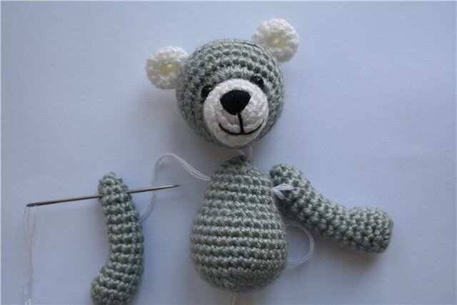 Финальные штрихи — это оформление мордочки. Из более тонкой пряжи вяжутся небольшие полукруглые ушки и накладка для носа. Несколько стежков черным мулине превратят безликую заготовку в улыбающегося персонажа. Можно вышить брови, придав мишке удивленное или задумчивое выражение.