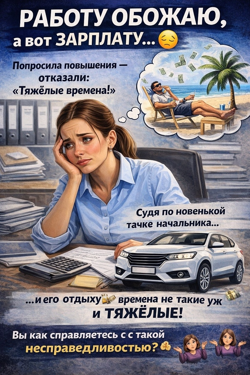 😔 Просила повышения — отказали, сославшись на “тяжёлые времена”. Ага… тяжёлые времена, судя по новенькой машине начальника и его отпуску на Мальдивах 🏖️💸 Чувствую себя обманутой и немного раздражённой. Ребята, как вы справляетесь с такой несправедливостью на работе? 👉 Подписаться на канал