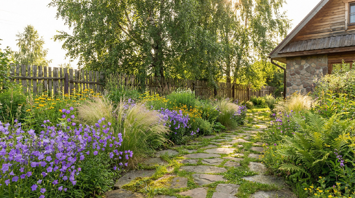 Если вы живёте в СНТ или деревне без строгих уставов, где соседи не требуют идеальных газонов под линейку. Если вы готовы принять природную неидеальность: трава может быть выше колена в середине лета, листья могут желтеть и опадать осенью, семена могут рассыпаться самосевом. Не подойдёт этот стиль, если в коттеджном посёлке требуют стриженые газоны и запрет на сорняки, если участок маленький и соседи близко — агрессивные растения могут вызвать конфликты. И точно не подойдёт, если вы хотите абсолютного контроля над каждым листиком и стерильной чистоты.