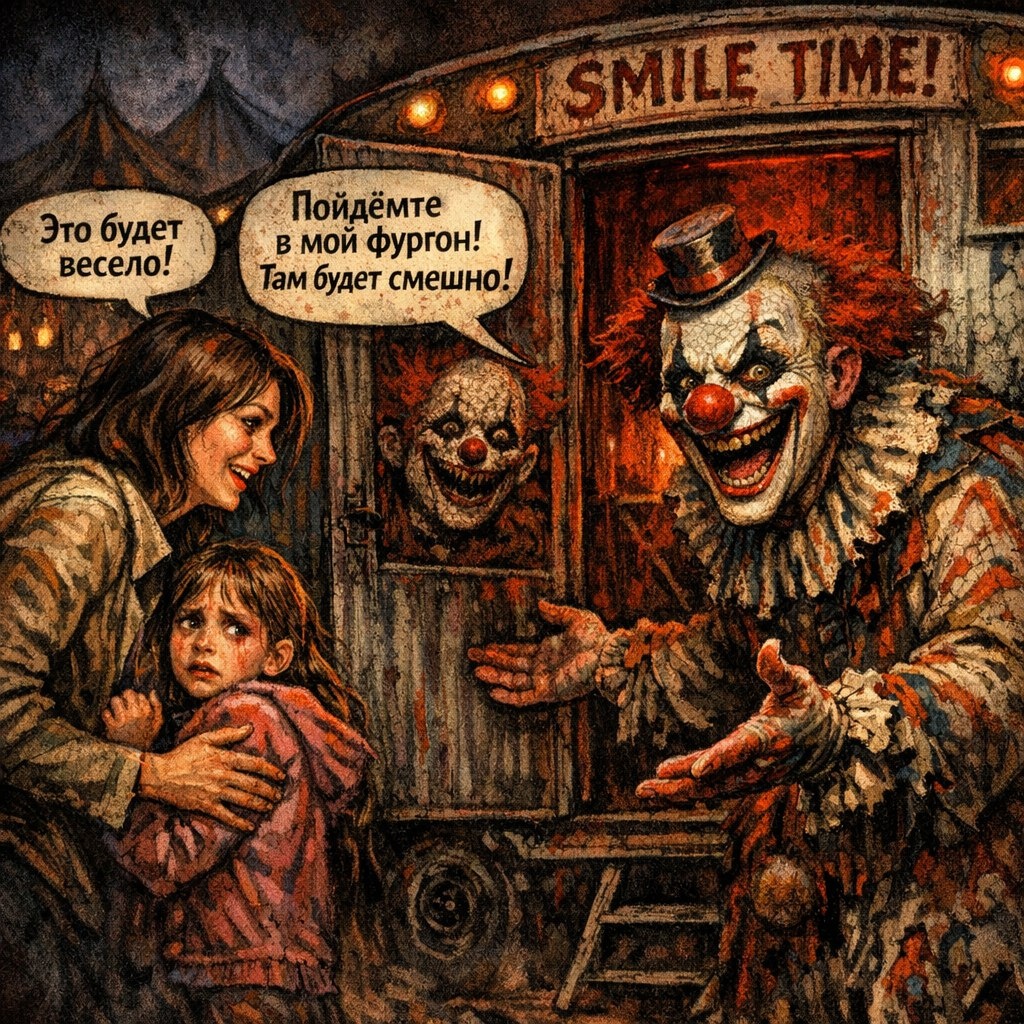 Цирк «Весельчак» пришёл в город, как внезапная лихорадка. Его разрисованные фургоны и аляповатые шатры выросли на пустыре за ночь, пахнущие пылью, дешёвой конфетной ватой и чем-то ещё — сладковатым и гнилостным, как запоздалый плод. Аня, с лицом, усталым от одинокого материнства, увидела в нём спасение. Свежий восторг для неё, долгожданный смех для дочери. «Просто надо выйти из рутины», — думала она, крепко сжимая маленькую, не желающую идти руку Кати. Внутри было шумно, жарко и лучезарно-фальшиво. Катя съёживалась с первого взгляда. Её детские инстинкты, не забитые ещё взрослой логикой, кричали тревогу. Клоуны, эти пародии на людей с их замёрзшими улыбками и глазами-пуговицами, пугали её до дрожи. Она тянула мать к выходу, бормоча: «Мама, они неправильные. Уходим». «Надо просто привыкнуть, солнышко, — отмахивалась Аня, и в её голосе звенела раздражённая сталь. — Вот сейчас начнётся, и ты будешь хохотать». Но ничего не начиналось. Только ожидание, густое, как сироп, да пронизывающие вз