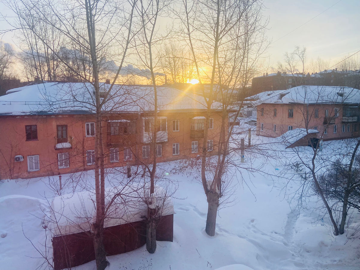 -19 по ощущениям -26 температура воздуха за окном. Ярко светит восходящее солнце и зябко.