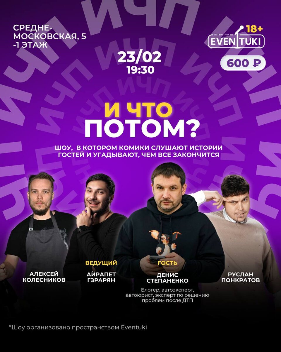 ?! 😄 Друзья, приглашаю вас весело провести время 23.02 в 19:30 на шоу «И что потом?!» Специально для вас скидка на билеты 50% по кодовому слову EXPERT Билеты можно приобрести уже сейчас по ссылке ниже 👇 https://eventuki.timepad.ru/event/3821910/