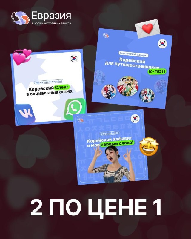 Мы подготовили сразу две акции, которые действуют сейчас — можно порадовать себя, а можно сделать крутой подарок 🤍 ❤️ Марафоны и курсы на платформе — 2 по цене 1 берёте один курс — второй получаете в подарок. Можно: — пройти оба самостоятельно (закрыть сразу две цели), — или один оставить себе, а второй подарить близкому человеку. Идеально, если давно хотели начать язык, но откладывали. Или если есть подруга/парень/коллега, который «всё собирается». Промокод: 2В1 ❤️ Подарочные сертификаты со скидкой 25% Если не знаете уровень человека или сомневаетесь в формате — сертификат решает всё. — Подходит на любые курсы и занятия — Действует гибко по срокам — Минус 25% от стоимости сейчас Подарок, который не будет лежать на полке, а реально запустит прогресс 💘 Промокод: СЕРДЦЕ Акции действуют до конца февраля 💌 Чтобы забрать своё предложение, просто напишите свой промокод в @Eurasia_online_help_bot — менеджер пришлёт детали и зафиксирует за вами условия Пора дарить не вещи, а во
