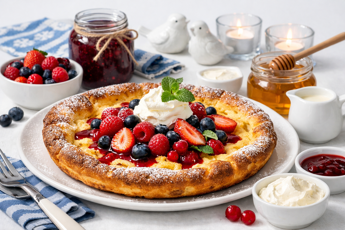 Есть рецепты, которые спасают утро, когда не хочется стоять у плиты и переворачивать блины по одному. Этот финский блин делается так: смешал - вылил - поставил в духовку. Через полчаса он поднимается шапкой, по краям румянится, а внутри остаётся нежным, как запечённый крем.