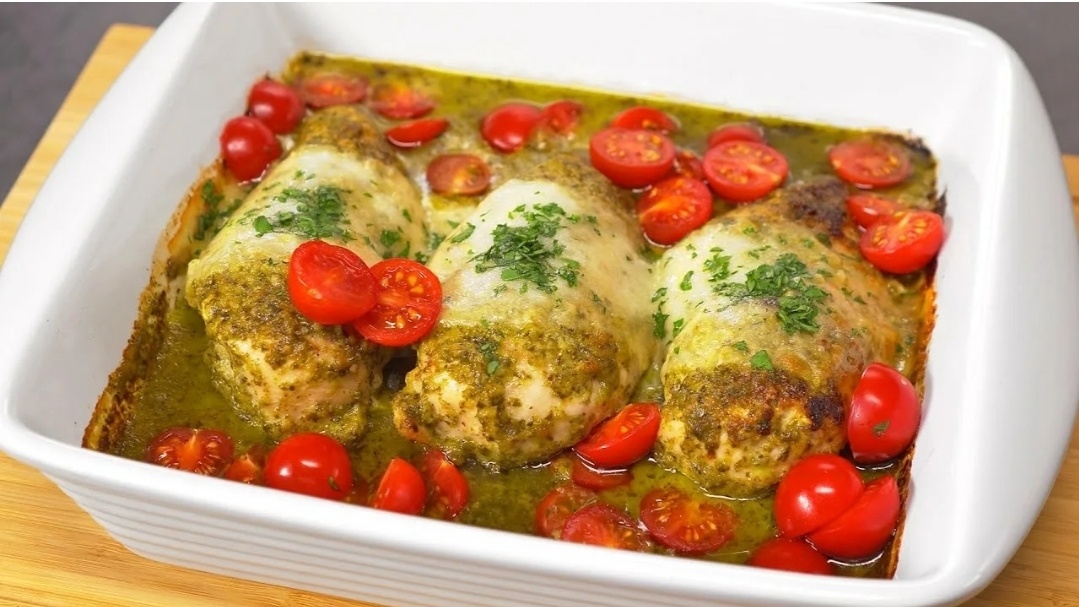 Это блюдо я подсмотрела в одном кулинарном шоу, немного упростила под наши семейные реалии, и теперь оно у нас в фаворитах. Представьте: сочная куриная грудка под ароматной шапочкой из песто и тягучей, расплавленной моцареллы. Пальчики оближешь! И готовится всё быстро, что для нас, хозяек, очень важно.