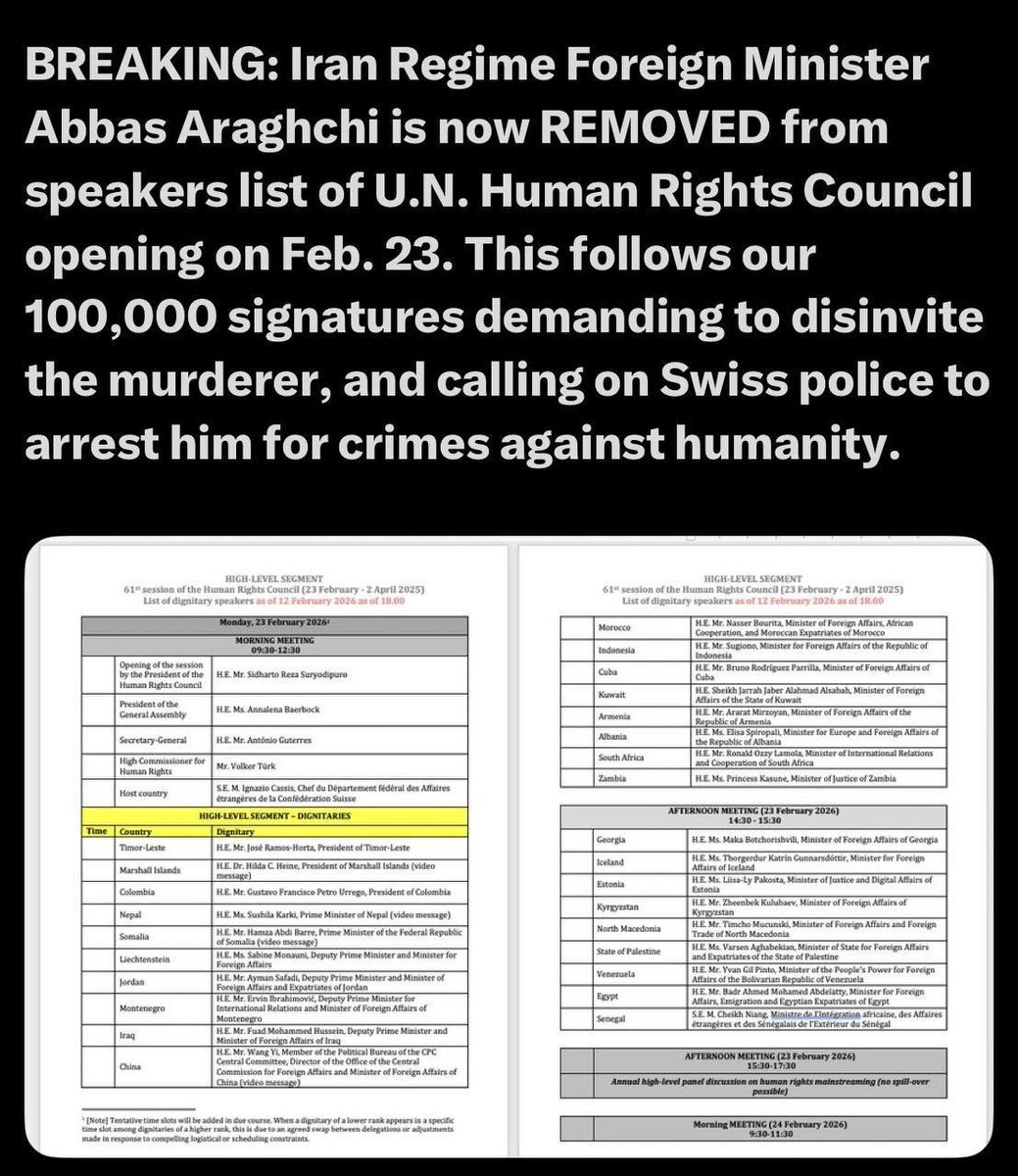 Министр иностранных дел Ирана Аббас Аракчи был исключен из списка спикеров на заседании Совета по правам человека ООН , которое состоится 23