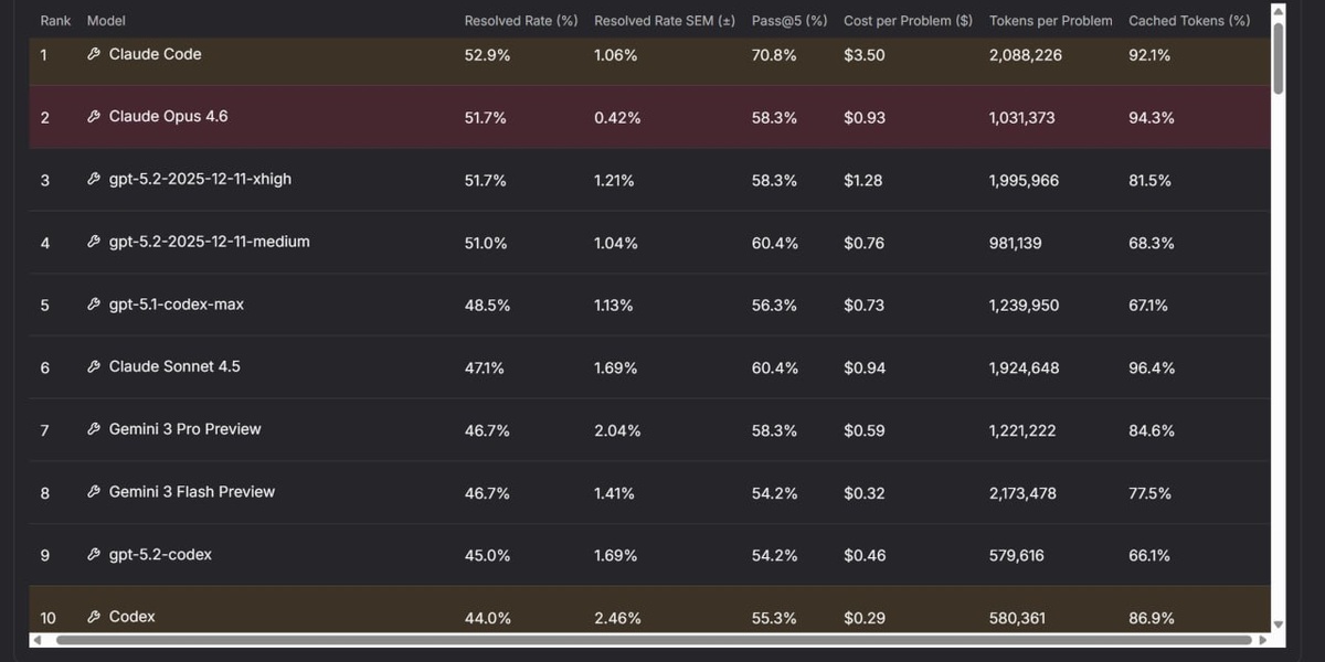 Команда nebius обновила re-bench, добавив новые модели и задачи за январь. В лидерах — Claude Opus 4.6, Claude Code (на той же архитектуре) и GPT-5.2. Для GPT-5.2 тестировали две настройки длины рассуждений, результаты совпали, но при средней длине расход токенов снижается вдвое. Все четыре лидера показывают схожие результаты при первой попытке решения задачи. При пяти попытках и зачёте лучшего результата Claude Code выходит вперёд — 70,8% против ~60% у остальных. Результаты GPT-5.2-Codex как отдельной модели и Codex как обёртки оказались низкими. Причины пока неясны. • Весь опенсорс значительно уступает лидерам. • Kimi K2.5 показал худшие результаты, чем Kimi K2 Thinking. • Qwen3-Coder-Next (3 млрд параметров, Alibaba) опередил DeepSeek v3.2 и занял место между Minimax 2.5 и GLM-5.