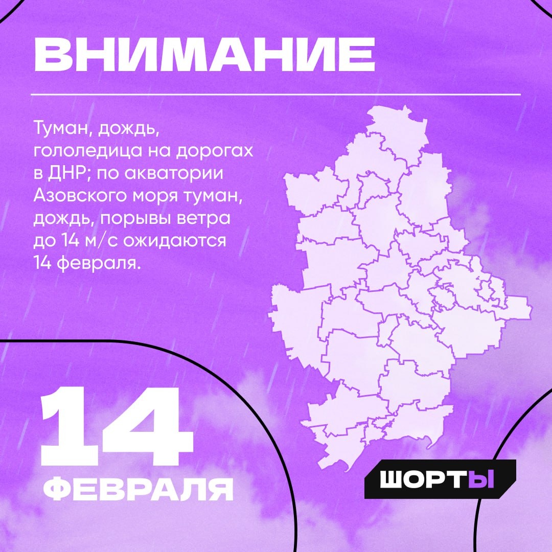 Туман, дождь, гололедица на дорогах в ДНР; по акватории Азовского моря туман, дождь, порывы ветра до 14 м/с ожидаются 14 февраля.