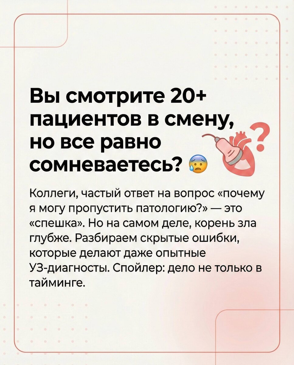 И знаете, что я поняла? Самая большая ошибка врача УЗД — это не пропущенная патология, а иллюзия, что ты уже всему научился. Я вижу коллег, которые «гонят поток» по 100/500 пациентов за смену. Они работают быстро, четко, по протоколу. Не всегда в такой ситуации есть возможность глубоко разобраться, а после смены уже нет ни сил ни желания. И иногда червячок сомнения бурчит внутри: «А вдруг? Вдруг я не туда нажал? Вдруг я неправильно расценил этот допплер?» Но чаще всего виновата даже не спешка. Спешка — это лишь следствие. Причина глубже. В моем закрытом чате для врачей мы разбираем сложные случаи, и я выделила 7 главных «врагов» диагностики: ✗ Слепая анатомия. Когда знаешь расположение структур, но не чувствуешь анатомию настоящего пациента. Нельзя искать болезнь, не зная эталона идеального здоровья. ✗ Техника «на автопилоте». Неверная позиция датчика, неправильный угол в PW или рамка в ЦДК— это не просто «грязная картинка». Это потерянная информация, которую пациент унесет домой