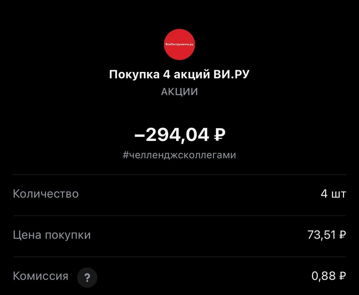 ! Покупка на сегодня #367 Статистика портфеля на стороннем сервисе, можно посмотреть по "ссылке" Напомню это челлендж с коллегами, каждый рабочий день пополняем брокерский счет на 250 рублей и инвестируем. Если возникли вопросы или есть не понимание, что делать. Задавайте «тут» Покупка #367 🟢 “ВИ.РУ” 73.51 rub #VSEH 4 лота #каждыйсможет #челенджсколлегами ✈️ Стас Мироненко