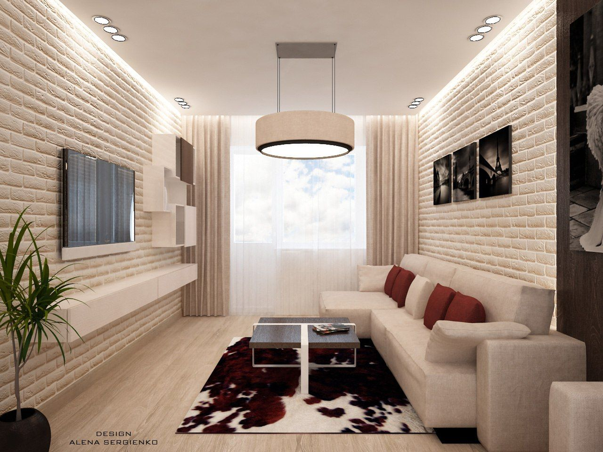 Чтобы комната перестала быть длинной «кишкой», нужно визуально приблизить дальнюю стену и раздвинуть боковые.